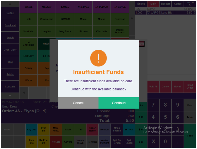 Taking you back to the Order screen with the remaining amount ready to be paid by an alternate